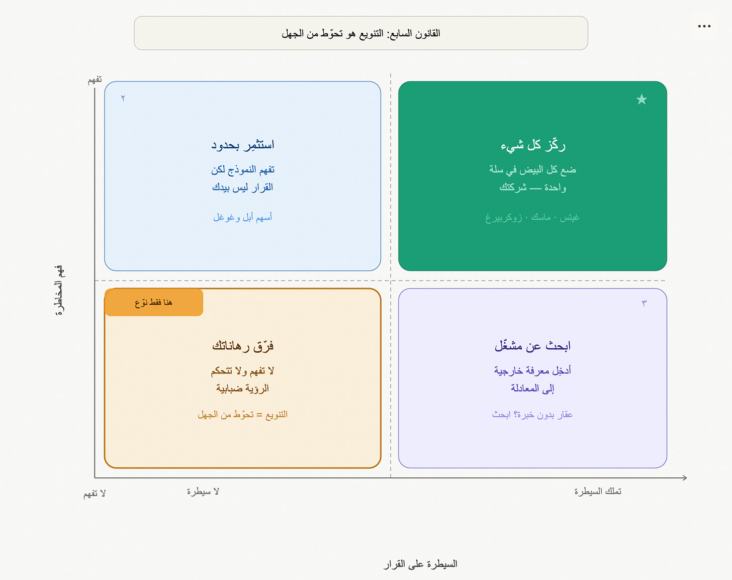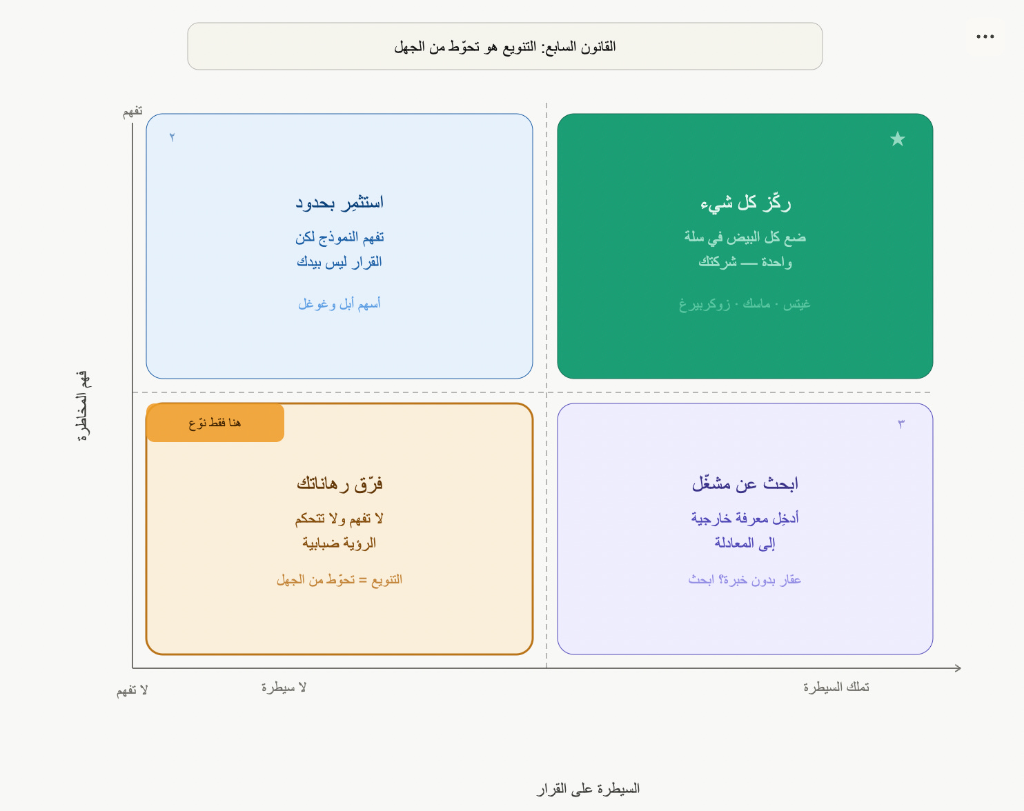 المربع الثاني — تفهم المخاطرة لكن لا تملك السيطرة: استثمر، لكن بحدود. أسهم أبل وغوغل — أنت تفهم النموذج، لكن القرار ليس بيدك.