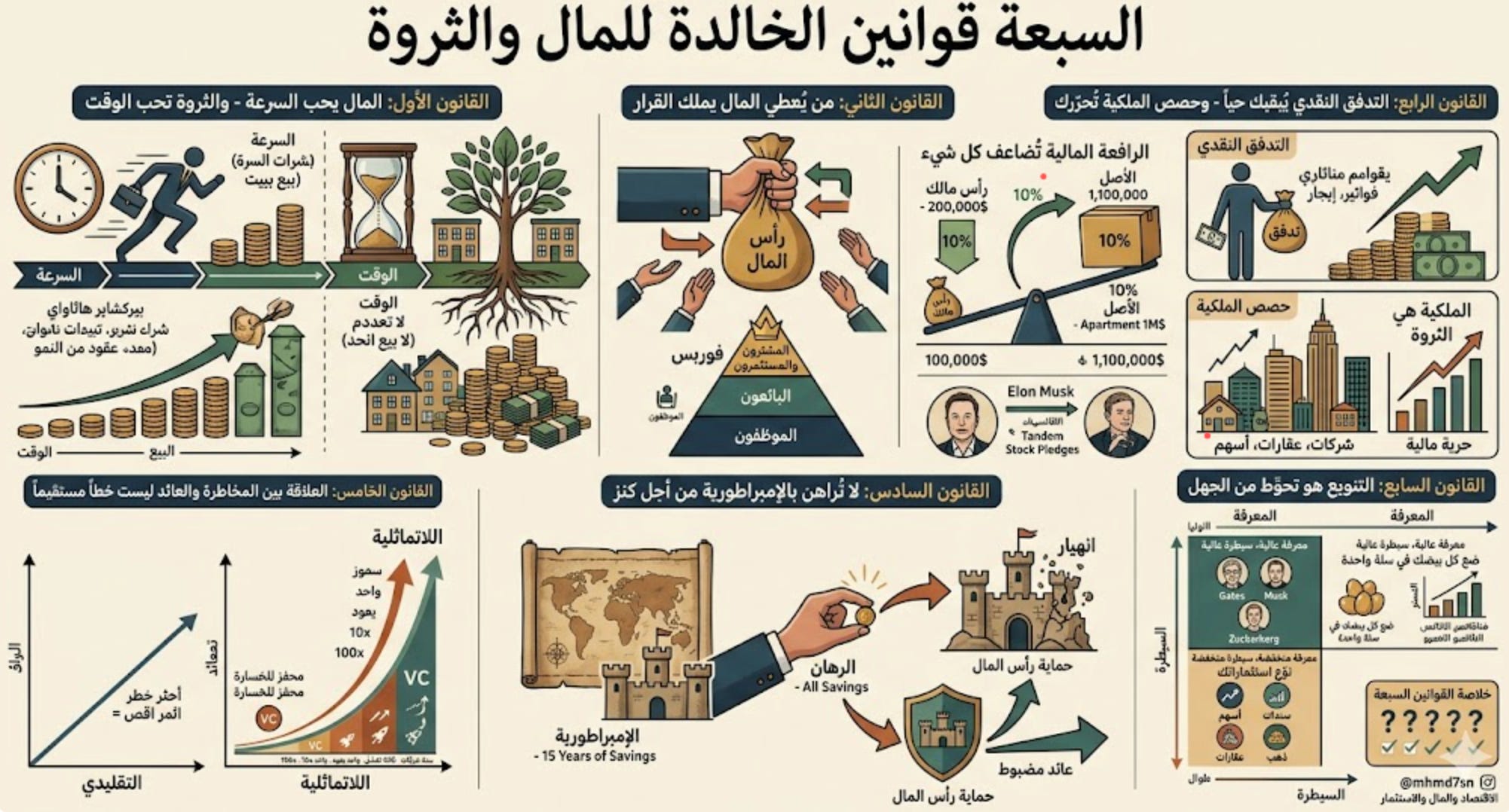 هذه القوانين السبعة ليست نظريات أكاديمية. هي قواعد تعمل بها الثروات الكبرى منذ عقود — بعيداً عن المناهج الدراسية وبعيداً عن أغلب النقاشات العامة.